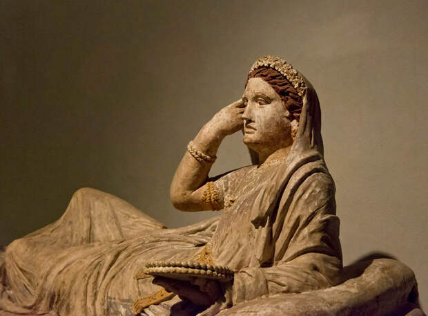 Этруски сопротивлялись, нужно думать. Но им назначили уничтожение. По гендерному признаку, только мужчин истребляли. Почему так? Традиция. Судя по археологии, этрусские женщины были куда свободнее своих товарок — римлянок и гречанок. Они явно занимали в обществе особое и почетное положение. Потому что в гробницах им отводилось особое, равное мужчинам место, соразмерное посмертное почитание.