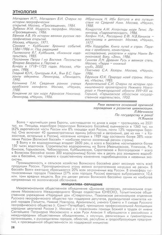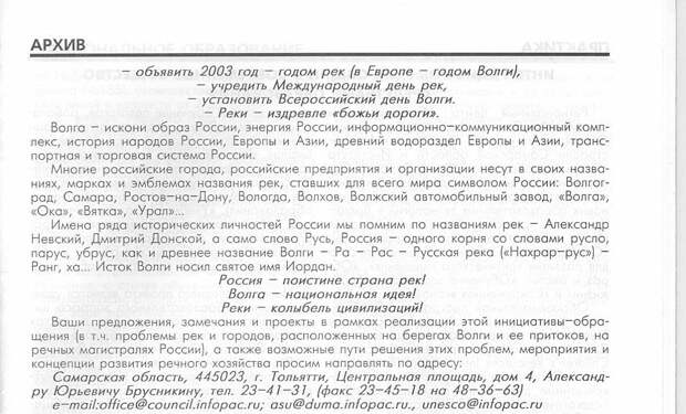 (поддержанные в начале века рядом депутатов (руководителей) Тольятти, Нижнего Новгорода, Архангельска и официальным решением Учёного совета Русского географического общества и 11 Съезда РГО; инициативы: "День Волги - День рек", "Год Волги - Год рек" получили благословение от имени Святейшего Патриарха Московского и всея Руси Алексея II):