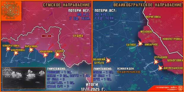 На Сумском направлении российская авиация возобновила интенсивные удары по позициям ВСУ на всём участке фронта в Сумской области. Штурмовые подразделения группировки войск «Север» продолжили продавливать оборону противника в лесополосах. Противник пытается нарастить количество боевых групп для проведения контратак. Наши штурмовики продвинулись на трёх направлениях вглубь Сумской области. Общее продвижение составило до 300 м. В районе Андреевки ударами авиации ВКС РФ поражены позиции 158-й ОМБр ВСУ.
