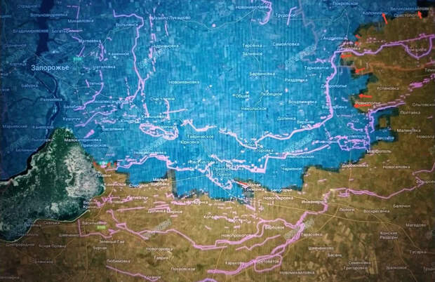 Подразделения группировок войск «Днепр» и «Восток» продолжают развивать наступление на направлении. Десантура продвигается в Приморском и Степногорске, несмотря на очень высокую плотность ударных дронов противника в небе. На Ореховском участке ВС РФ зачищают западную окраину Малой Токмачки (до Орехова остаётся менее 2 км), охватили Новоданиловку на северном фланге. На Гуляйпольском участке наши подразделения ведут бои восточнее Гуляйполя в районе Весёлое – Зелёный Гай – Высокое (Червоное) – Затишье. На северном охвате Гуляйполя ВС РФ продвинулись западнее Ровнополья и Яблоково севернее Целинной балки к окраинам развалин Добровольное в направлении Варваровки. В дальнейшем продвижении за Варваровку большую роль сыграет обход 3-го оборонительного рубежа ВСУ в районе Даниловки и Отрадного. Выход в тыл этому рубежу может значительно облегчить продвижение наших подразделений за реку Гайчур, так как опорные пункты и позиции 3-го рубежа ВСУ расположены на высотах левого берега (он более высокий).