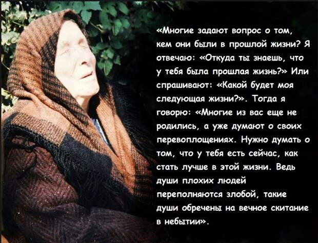 Кстати, некоторые гости Ванги интересовались своими прошлыми и будущими перерождениями. Но на такие вопросы ясновидящая не отвечала. Она говорила: