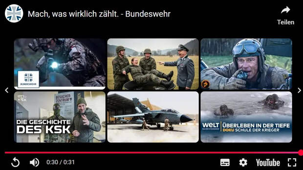 В социальных сетях — официальные аккаунты Бундесвера в Instagram, TikTok, YouTube, Facebook и X (Twitter). Только на официальном YouTube-канале Бундесвера можно найти сегодня 3883 видео, напрямую связанные с информацией и рекламой воинской службы.