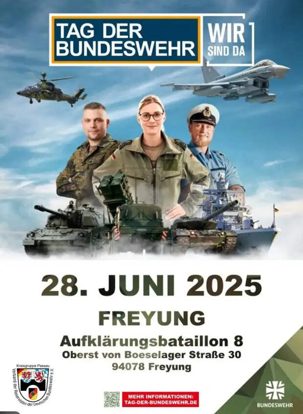 Плакат-приглашение на «День Бундесвера: «Мы здесь. 28 июня 2025 года. Город Фроюнг, Восьмой разведбатальон»