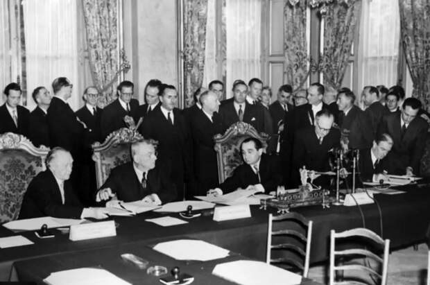 Подписание Соглашений. За столом сидят слева направо: Конрад Аденауэр (Konrad Adenauer) – канцлер ФРГ, Джон Фостер Даллес (John Foster Dulles) — министр иностранных дел США в качестве наблюдателя, Пьер Мендес-Франс (Pierre Mendès France) — премьер-министр Франции, Антони Иден (Anthony Eden) — министр иностранных дел Великобритании