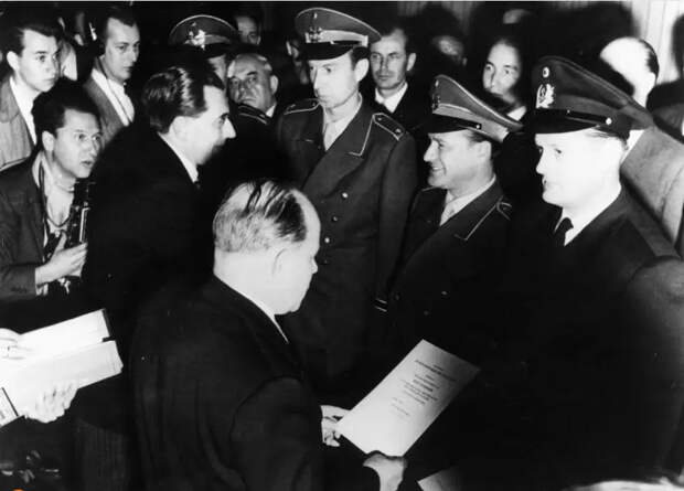 Федеральный министр обороны Теодор Бланк (Theodor Blank) вручает первым военнослужащим Бундесвера почётные свидетельства о назначении после принятия присяги.